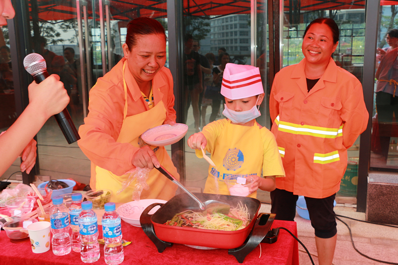 搶答活動(dòng)結(jié)束之后,進(jìn)入“小廚神”廚藝大比拼環(huán)節(jié)。由園林綠化工人、水電維修物業(yè)工人、保潔人員等進(jìn)城務(wù)工人員組成的5組家庭展開了激烈的廚藝大比拼競(jìng)賽???,小廚神們?cè)诟改傅闹笇?dǎo)下井井有條地備菜、炒菜、起鍋,忙得不亦樂乎。各色菜式色香味俱全,充分展現(xiàn)了孩子們“小當(dāng)家”的本領(lǐng)。半小時(shí)后,小廚神們?cè)诖蠹业臒崃艺坡曋型瓿闪吮荣惒似?,廚藝大師及現(xiàn)場(chǎng)觀眾根據(jù)完成的速度、菜品、味道等評(píng)出廚藝大賽一等獎(jiǎng)1名,二等獎(jiǎng)2名,三等獎(jiǎng)3名,優(yōu)秀獎(jiǎng)10名。