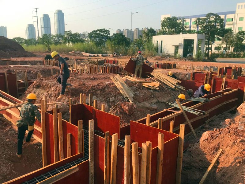 瑞聲南寧光學(xué)項目主產(chǎn)高精密手機鏡頭,包括一體式VCM雙攝、晶圓級玻璃(WLG)鏡頭、玻塑混合鏡頭等,是瑞聲核心技術(shù)之一,項目的盡快投產(chǎn)對于瑞聲公司在美國打壓中國通訊產(chǎn)業(yè)的大環(huán)境下?lián)屨籍a(chǎn)業(yè)鏈轉(zhuǎn)移先機,搶占市場份額;經(jīng)開區(qū)落實自治區(qū)強首府戰(zhàn)略、打造千億產(chǎn)業(yè)園等都有著十分重要的意義,是一個多贏格局。項目計劃2020年2月上旬正式投產(chǎn)。榮鑫公司在該項目中主要承擔(dān)附屬工程施工,包括設(shè)備用房、污水處理廠房、危品庫、空壓機房主體施工及園區(qū)道路、綠化等,是名符其實的配角,但在項目的前期階段,聚光燈卻始終照在這“配角”的身上。附屬工程中,設(shè)備用房、污水處理廠房等建筑面積共4000平方米,是項目裝修、安裝的基礎(chǔ)工程,投產(chǎn)倒排工期要求2019年12月25日前必須完成并交付安裝單位(道路綠化等配合項目總進度,不在此列),工期不足三個月!該部分用房面積雖不大,且大部分只有兩層,但由于特殊設(shè)計要求且項目處回填區(qū)域,涉及樁基、深基坑(5.5米)、高支模(8.3米)、防滲防腐等土建施工難點、費時點,不可控因素多,給工程按期完工帶來了極大的困難。該部分項目工程量不大,與后期裝修、安裝關(guān)系密切,本應(yīng)由裝修總包單位統(tǒng)一施工,但裝修單位一再推托,坦言不可能完成。最終管委將此部分項目授與了榮鑫公司。此時,裝修、安裝單位在觀望,業(yè)主、建設(shè)主管部門也都在捏把汗。